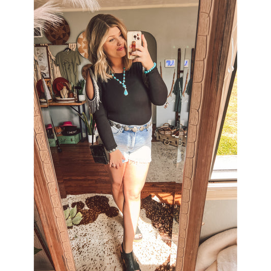 Cold Shoulder Rhinestone Fringe Bodysuit