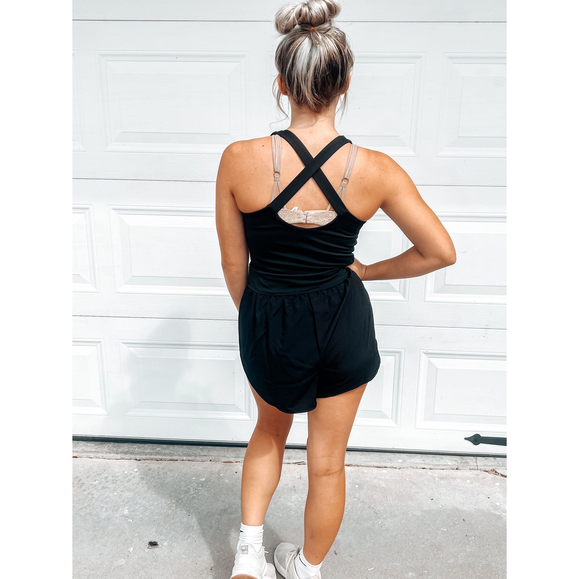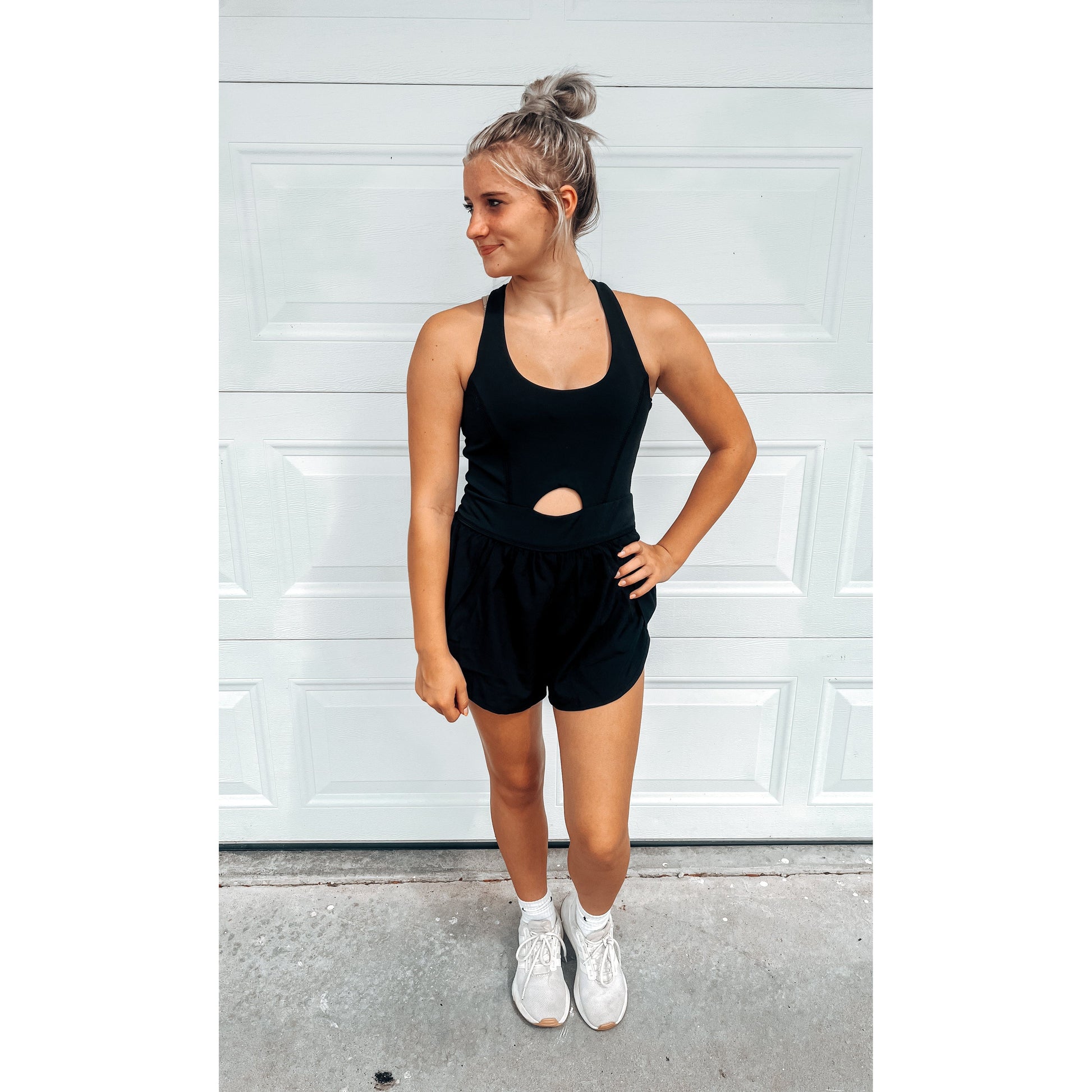 Front Cutout Detail Romper Activewear with Pantie Lining - Sleeveless - Cross Back - Athleisurewear