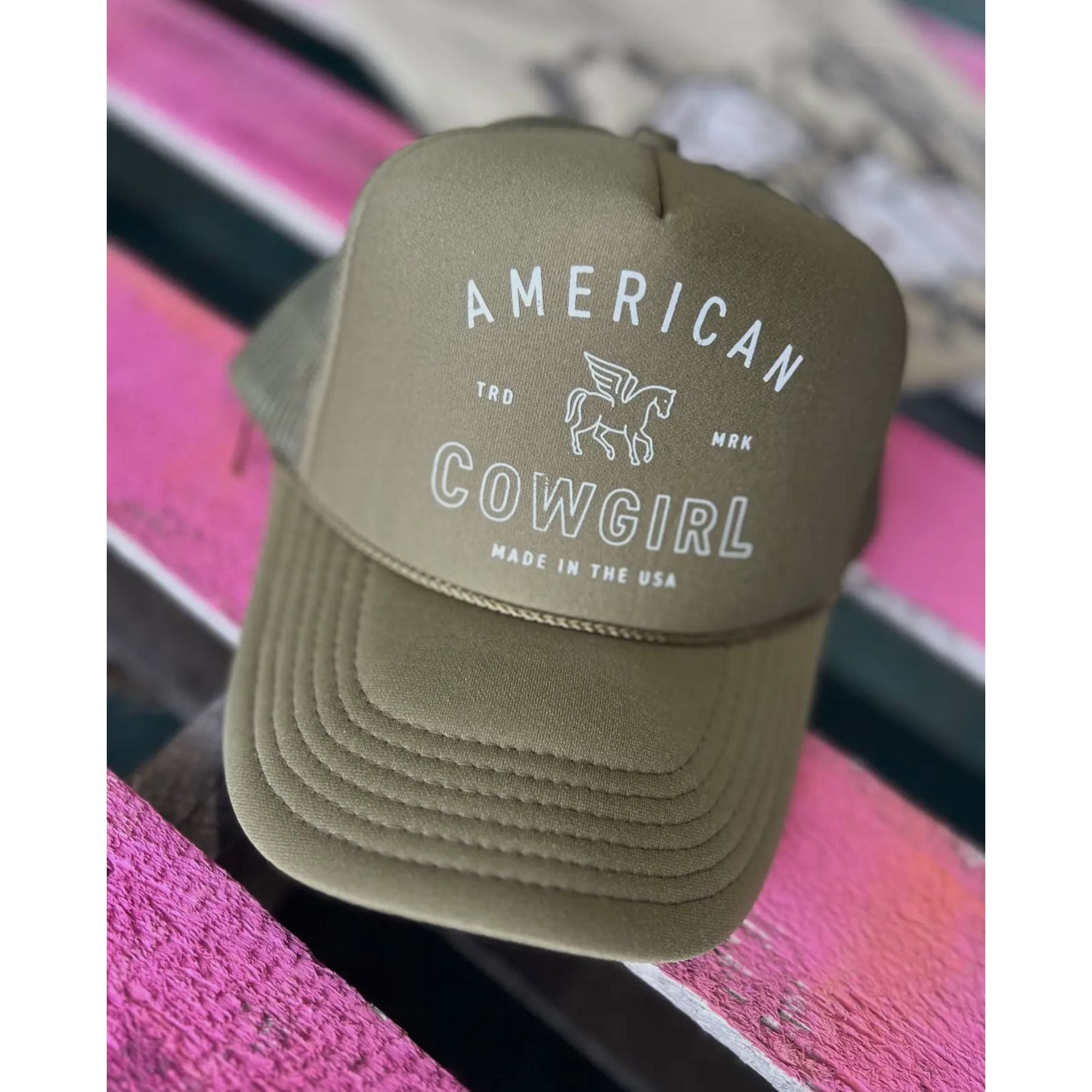 on olive green trucker