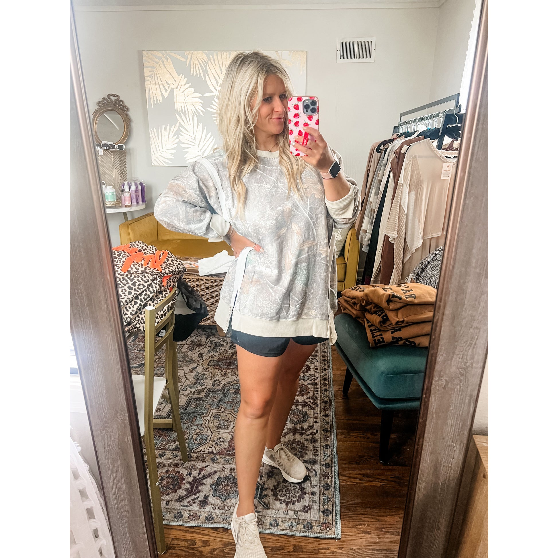 We spared no attention to detail in our sweatshirt! This forever timeless pullover is a slouchy, relaxed fit with exposed seaming, cute split cuff hem and ribbed trim detail! Has super soft "sweatshirt" feel on the inside! Now in a camo print!!