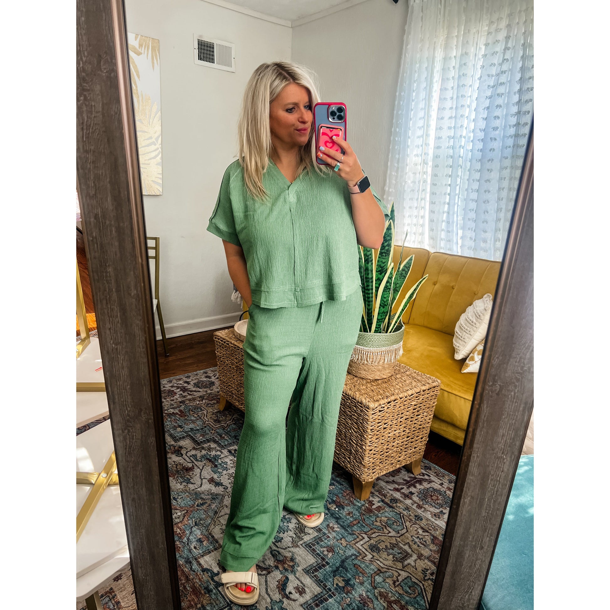 - Textured Knit Comfy Casual Top & Pants Set - Raw Edge Cute Detail TOP - Oversized Dolman Sleeve Top - V-Neck - Short Sleeve - Round Hem BOTTOM - Elastic Waist W/ Drawstring - Side Pockets