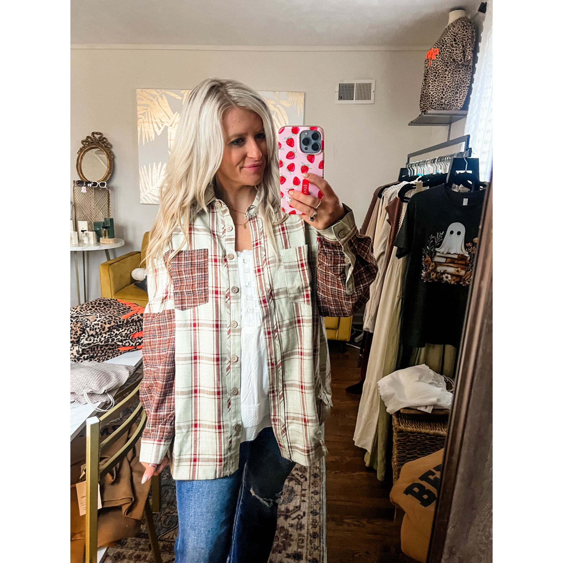 A cozy patchwork button-down with just the right amount of grunge and charm.