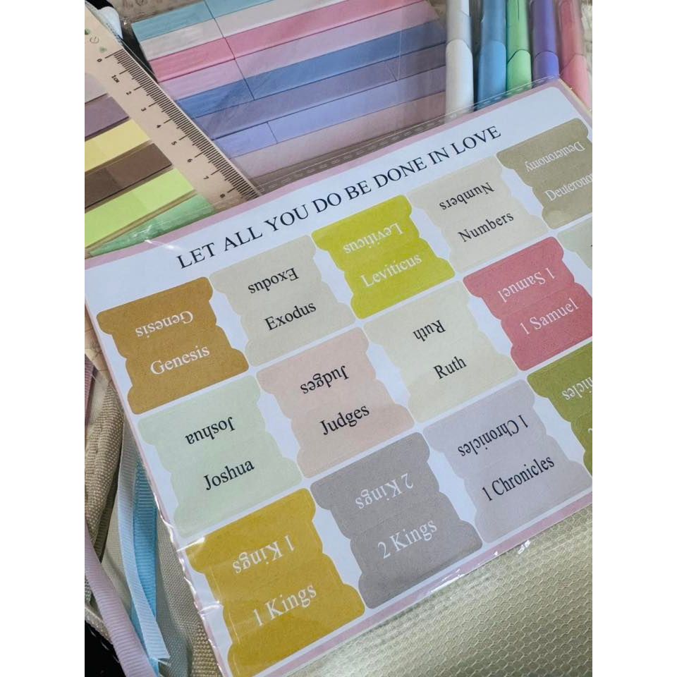 Comes with marker and highlighters, pens, bible tabs, post it note tabs
