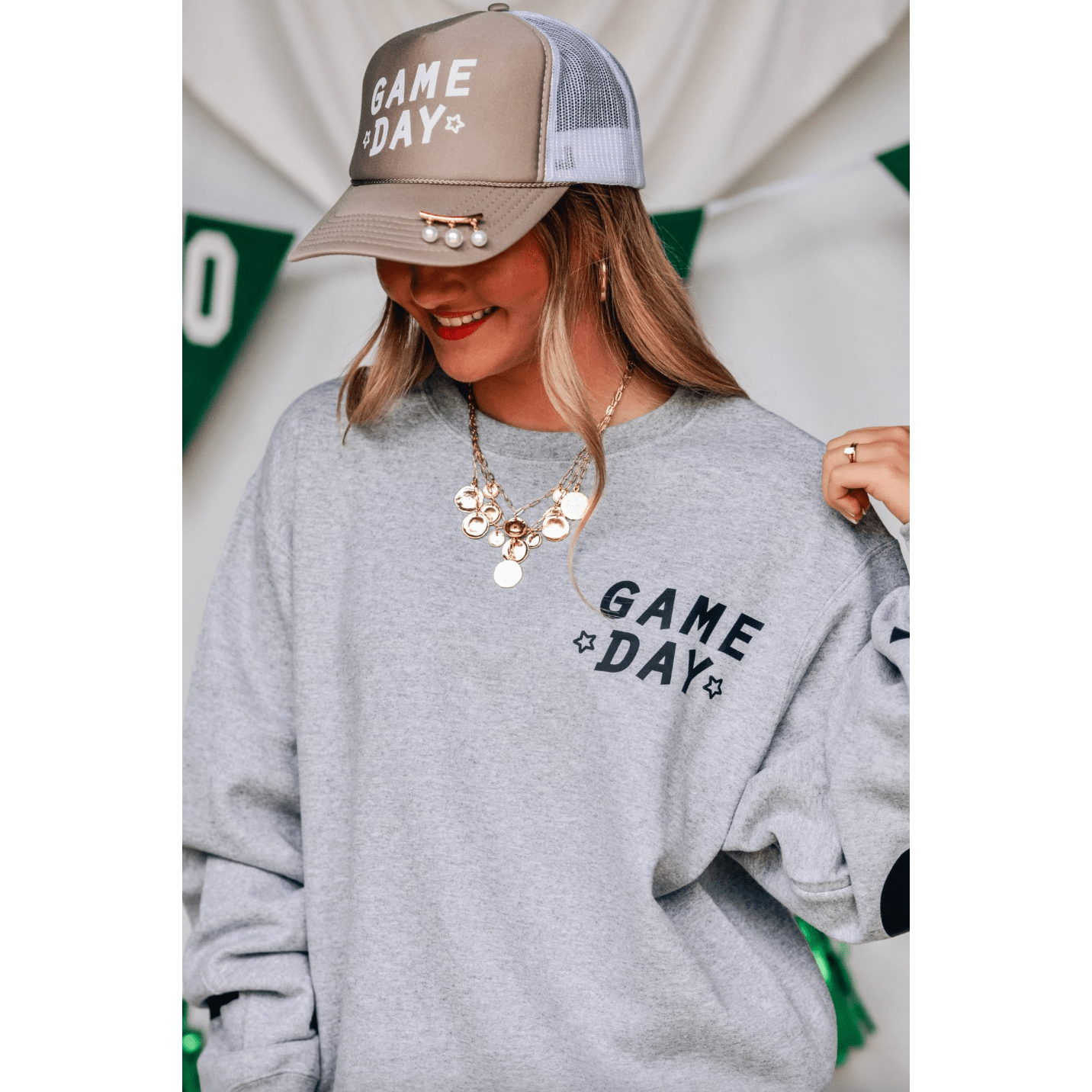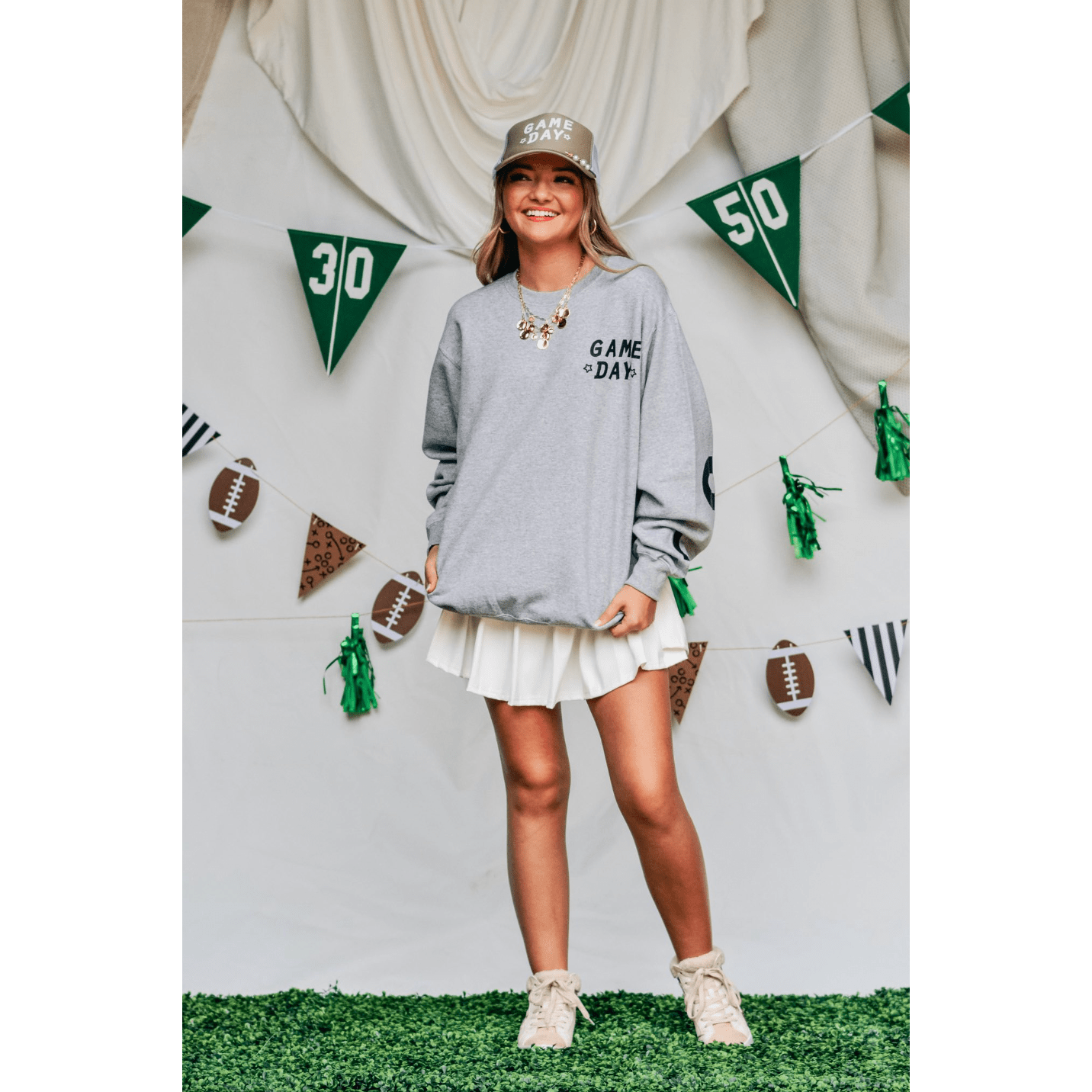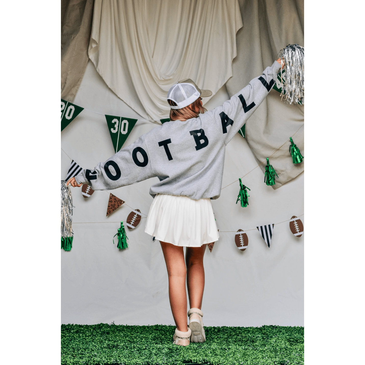 Calling all football fans — your new go-to game day look is here. The Football Game Day Gray Sweatshirt is made for cheering loud, tailgating hard, and repping your team in effortless style. With bold “GAME DAY” lettering on the front and oversized black “FOOTBALL” graphics wrapping from arm to arm across the back, this sweatshirt brings the energy whether you're in the stands or on the couch.