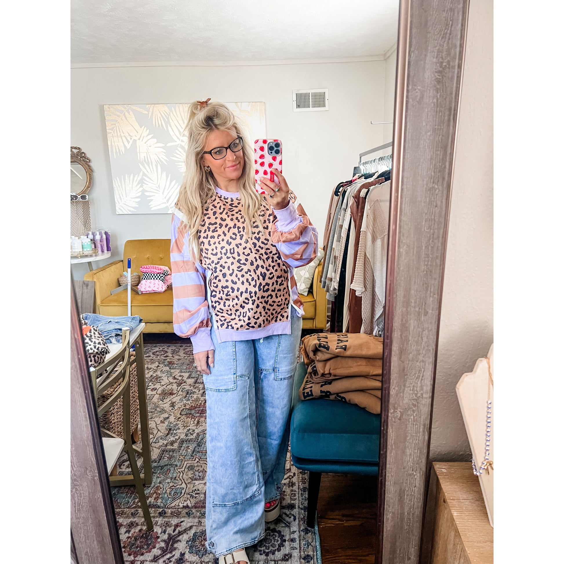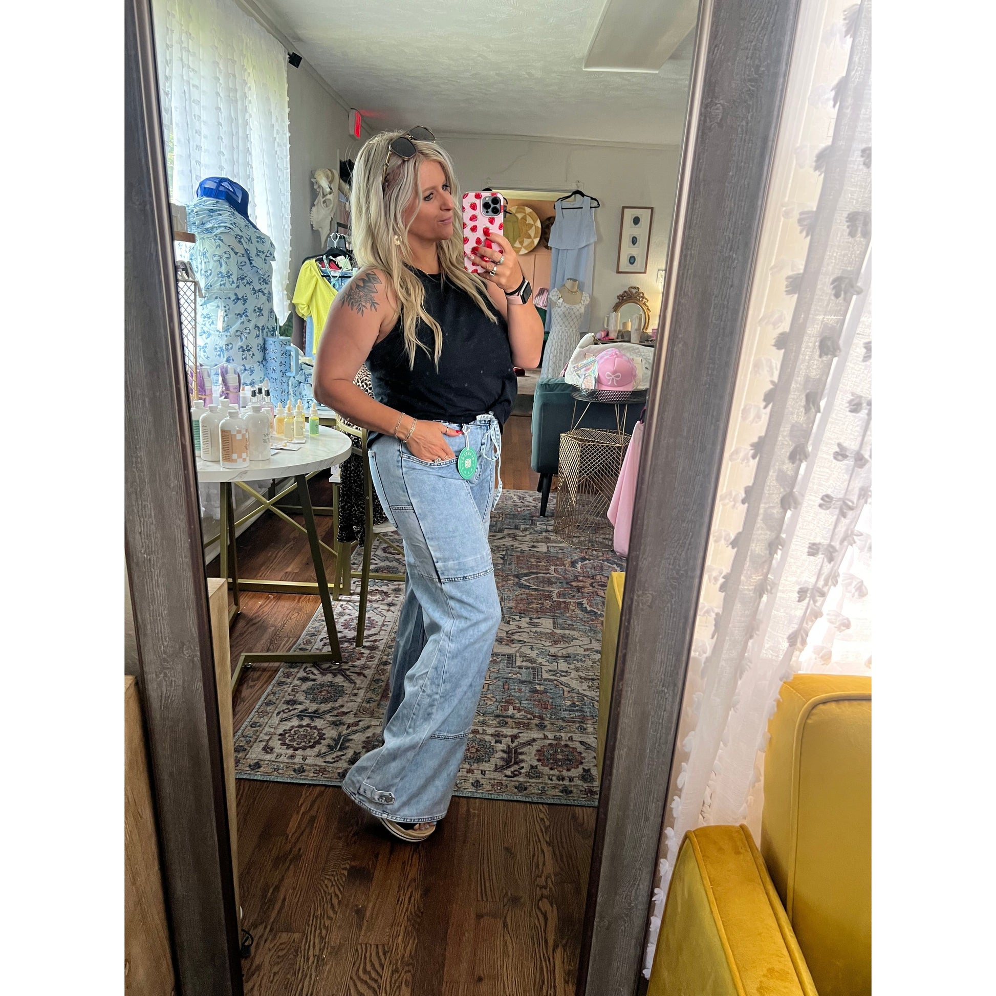 These cute large panel pocket jeans are just the right vibe for Summer! Cool and easy to wear! A cute tie waist add just the right touch! Semi high waisted, stretch and such a cute boho look!
