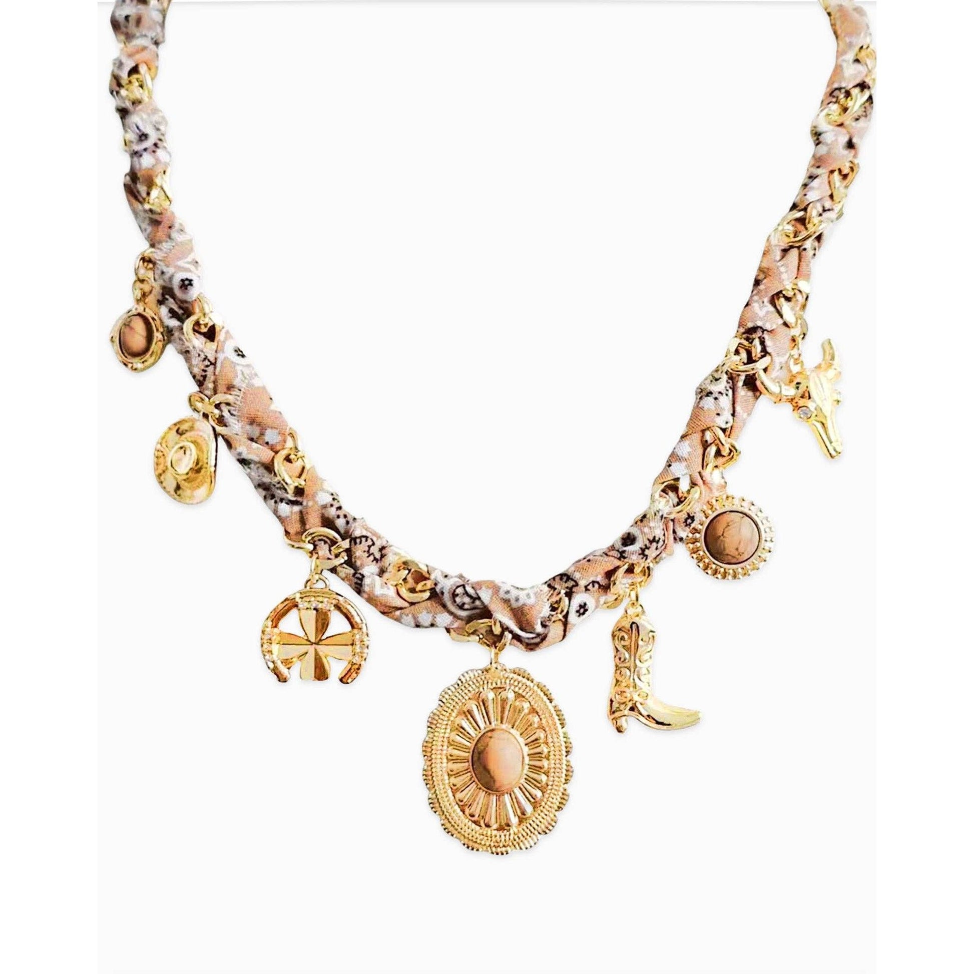 Paisley Scarf entwined with bold concho charms and western icons—horseshoe, star, and spur. This scarf necklace channels desert nights and cowgirl allure.