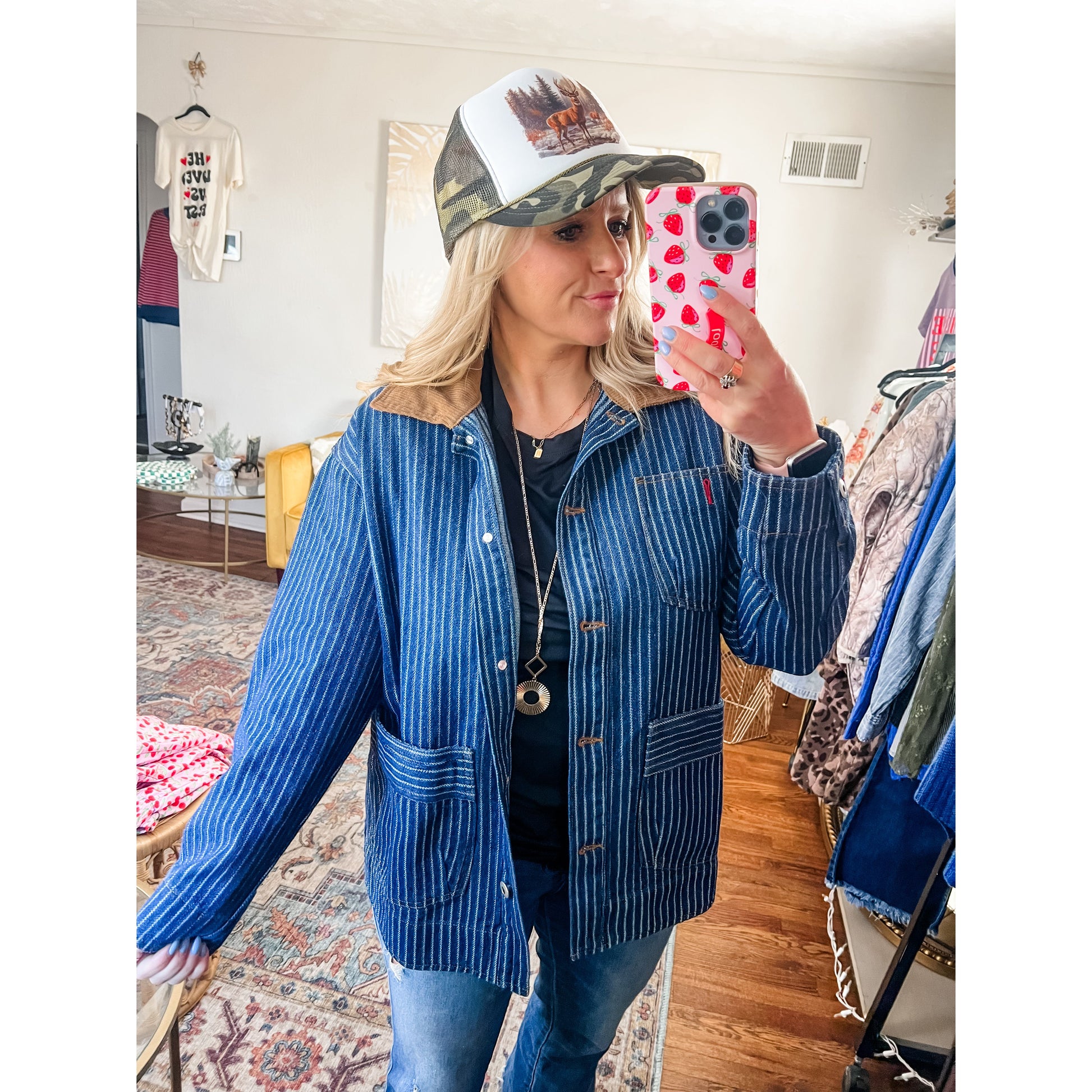 Pinstripe denim jacket with corduroy collar