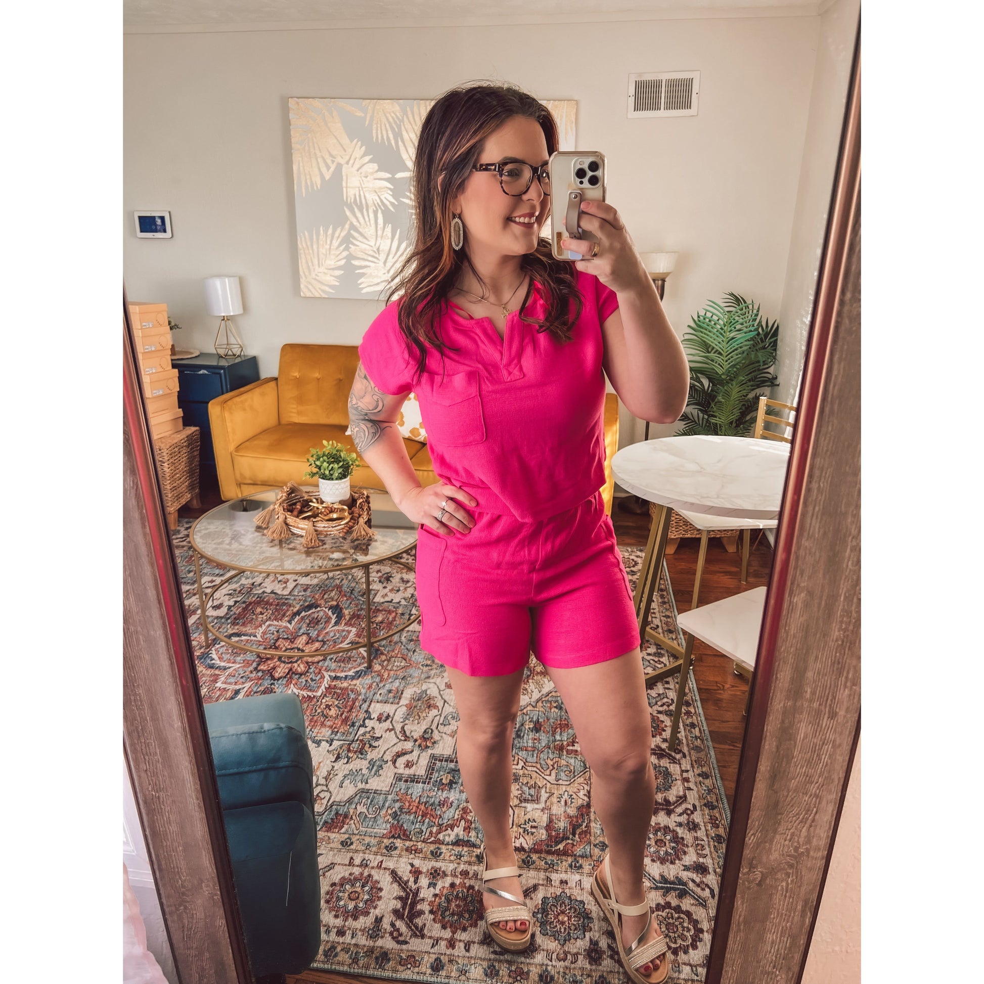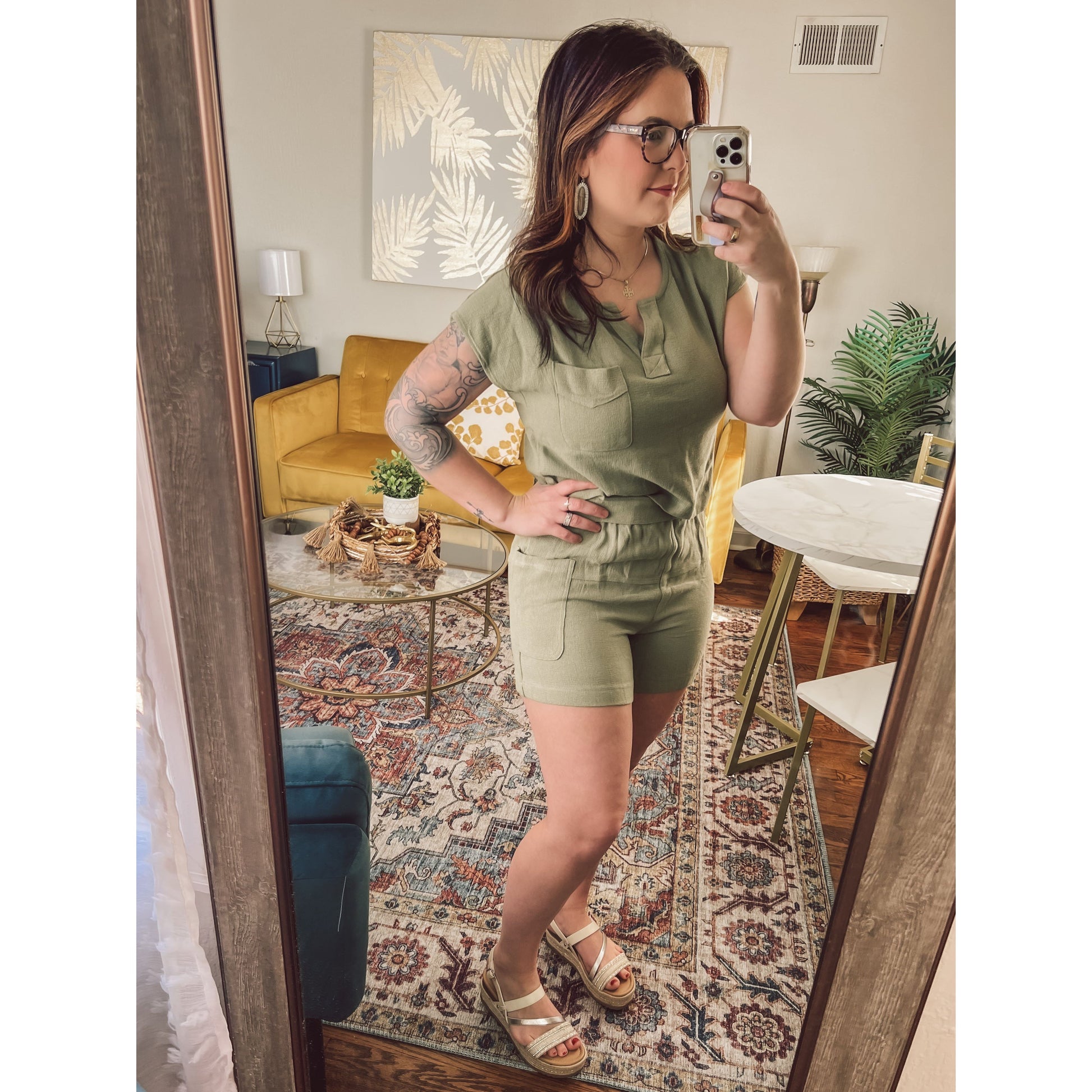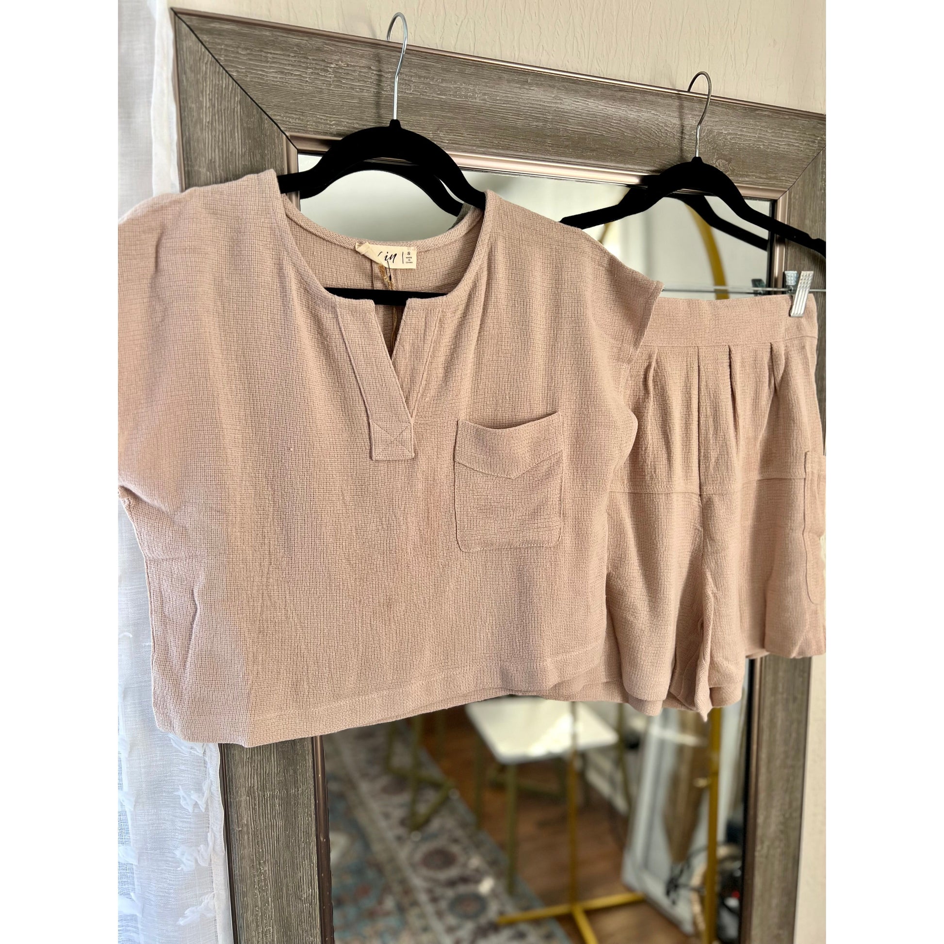 - Relaxed Fit Solid Woven Top & Shorts Set TOP - Short Dolman Sleeve - Split Neck - Patch Pocket - Crop Length - Minimalism - Sustainable - Old Money - Natural - Airily - Breezy - Eazy - Summer Staple BOTTOM - Back Elastic Waist - Waist Tie - Waist Ruffle Detail - Side Pockets