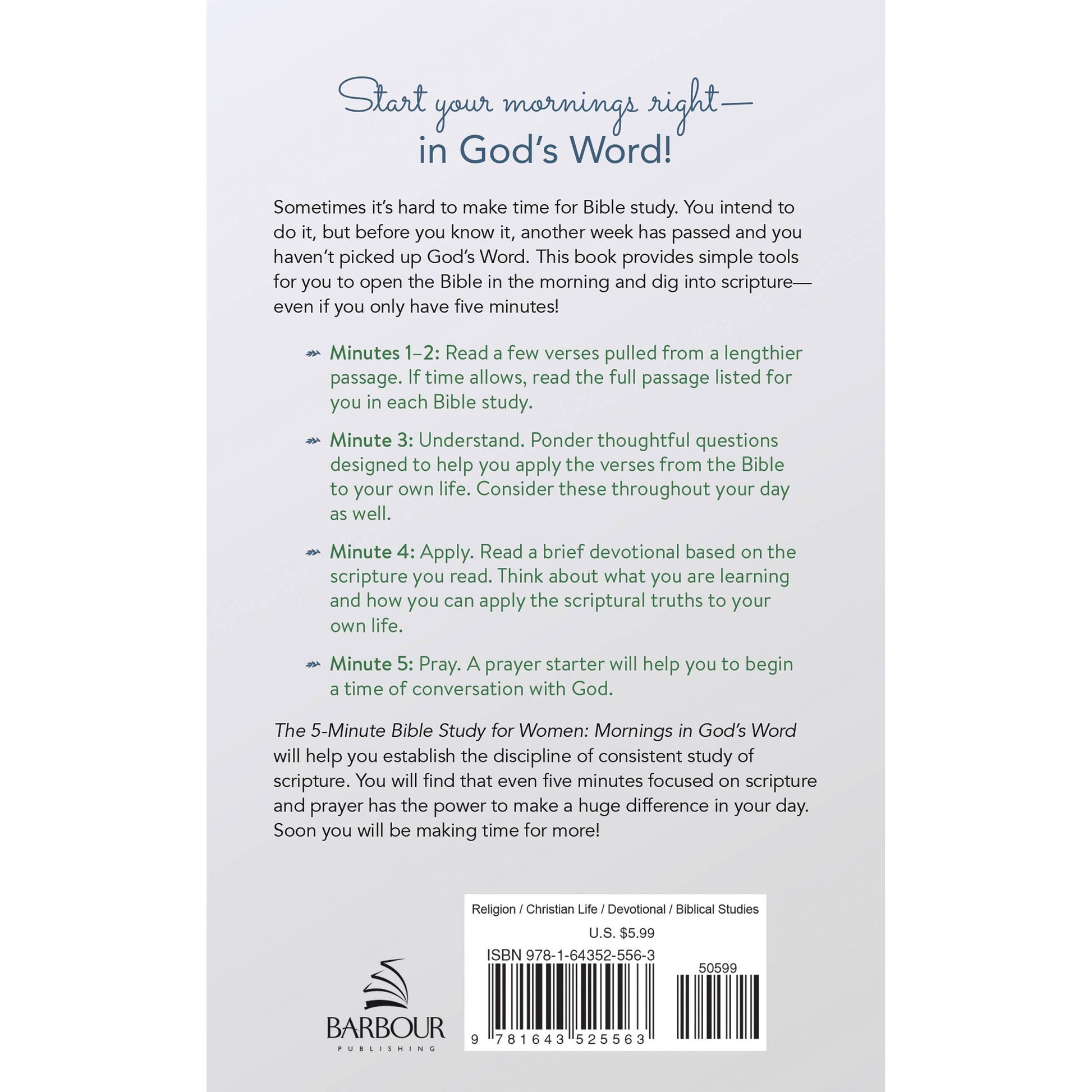 The 5-Minute Bible Study for Women: Mornings in God's Word will help you establish the discipline of consistent study of scripture. You will